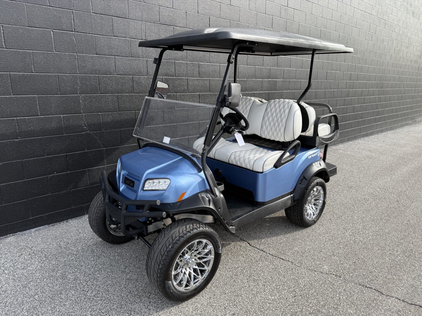 Finished in a premium Metallic Ice Blue body, this cart features upgraded seating, a factory lift kit, and durable all-terrain components that provide both style and capability.